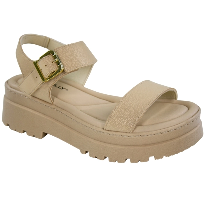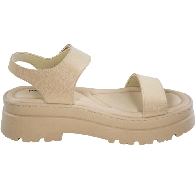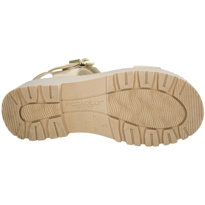A Sandália Feminina Piccadilly Anabela Tratorada, Possui a tecnologia Wide Fit, que oferece mais espaço interno na região frontal para acomodar melhor os pés mais largos, e uma manta de biofibra na planta do pé que absorve o impacto e ativa a circulação. Confeccionada em napa stretch soft star, um material que traz um brilho sutil e maciez. Conta com tiras largas e fivela ajustável na cor dourada, garantindo um calce prático e cheio de estilo. O solado emborrachado tem 5 cm de altura na parte traseira e 3 cm na dianteira .