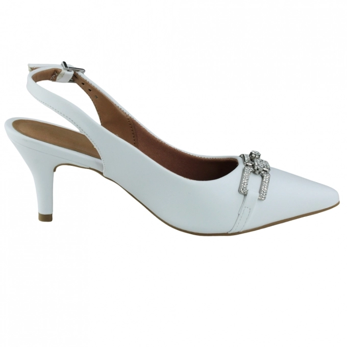 O Sapato Feminino Salto Channel, é um elegante modelo slingback com parte traseira aberta que se destaca pelo aplique metalizado e delicados strass na parte frontal com salto de 7,5 cm e bico fino, proporciona sofisticação e realça a postura feminina. Ideal para ocasiões formais e eventos noturnos, é perfeito para compor looks refinados com charme e estilo. Fechamento de fivela na lateral externa, sua parte interna combina napa e material têxtil, enquanto a palmilha em PU oferece conforto prolongado, mesmo durante longos períodos de uso.